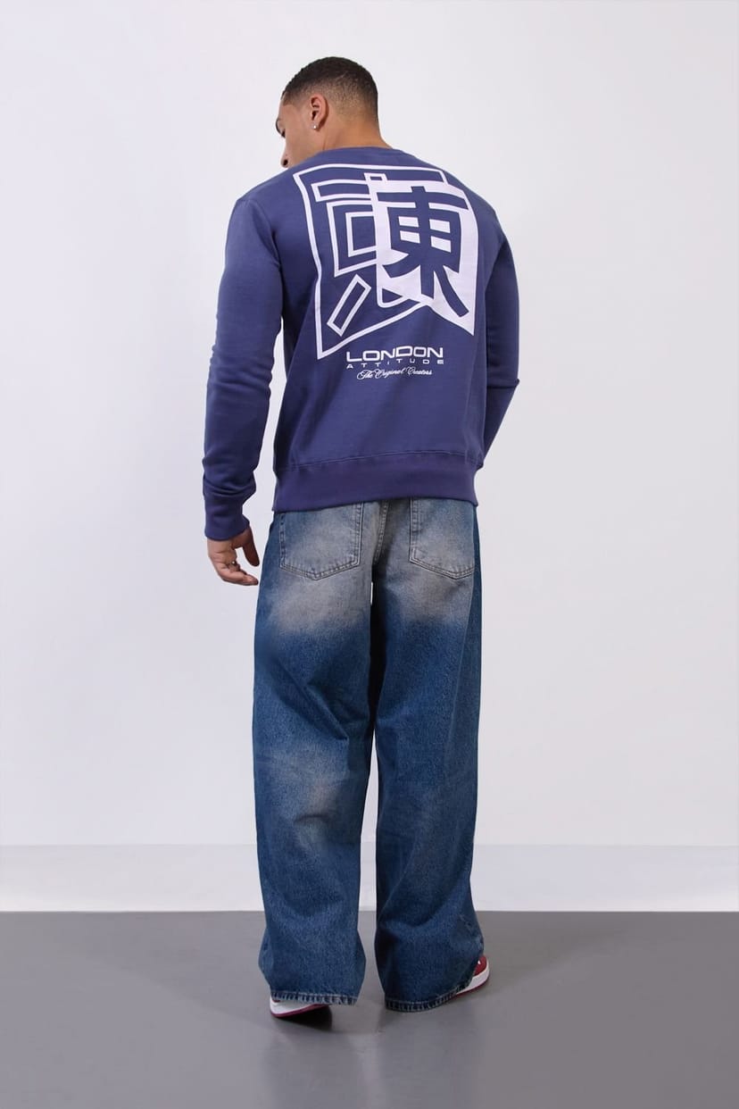 Elevate your streetwear with this London Attitude navy blue crewneck sweatshirt. Featuring a striking oversized white graphic print on the back and signature branding on the chest and hem. Crafted from soft, durable fabric for all-day comfort, this sweatshirt combines urban style and originality.