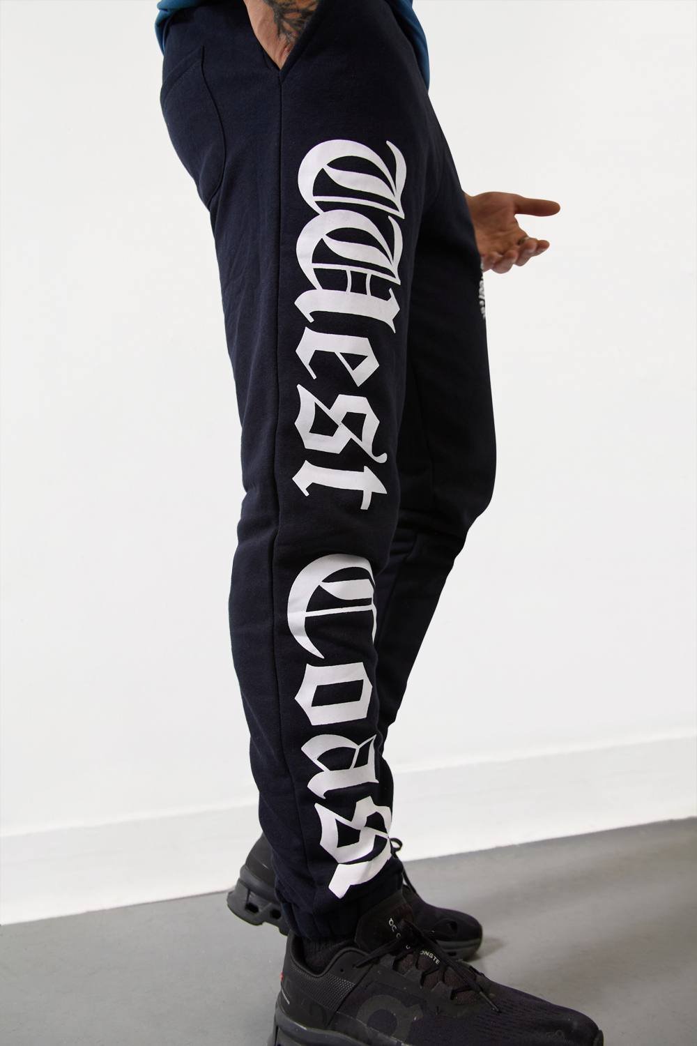 Stylish dark navy joggers by London Attitude featuring bold white West Coast lettering and an eagle emblem graphic on the thigh. Made from a premium cotton blend, these joggers offer a comfortable fit with an elastic waistband.