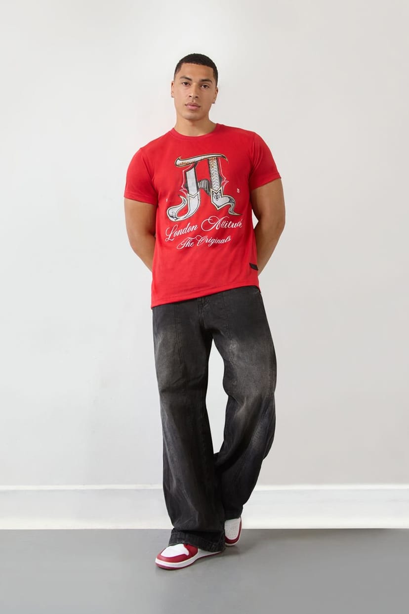 Elevate your casual look with the London Attitude Red Graphic A T-Shirt. Featuring a bold, ornate A design with intricate details and London Attitude The Originals script in white, this regular-fit T-Shirt combines style and comfort. Crafted in soft beige cotton, it's perfect for effortless streetwear.