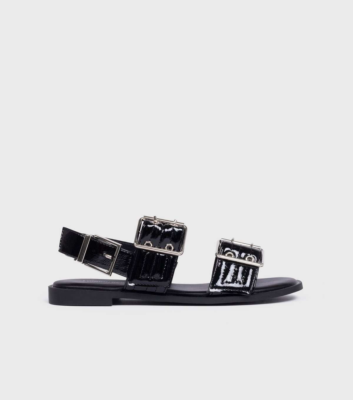 Chic black faux patent leather sandals from London Rebel. Featuring buckled straps and a flat heel, these sandals are perfect for warm-weather outings. The open toe design adds a touch of elegance.
