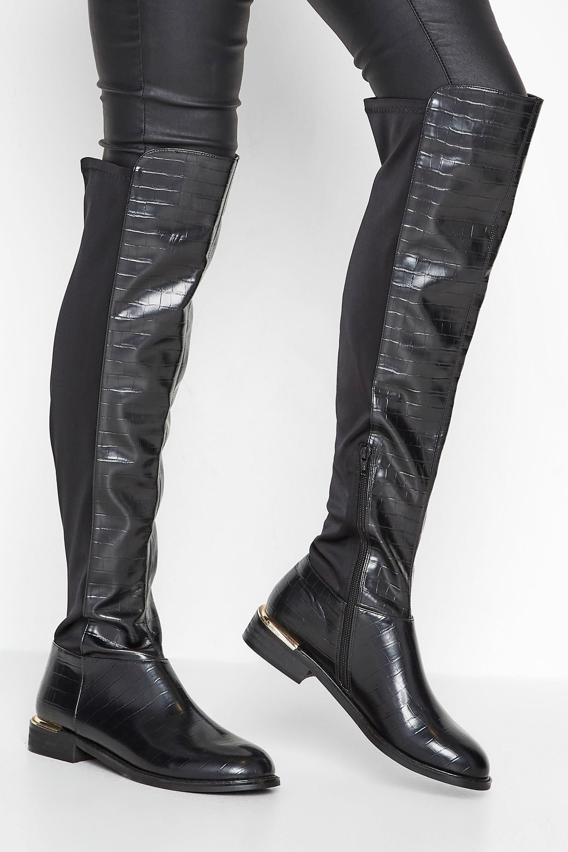 The Long Tall Sally Black Faux Leather Croc Boots is available in sizes 10.
