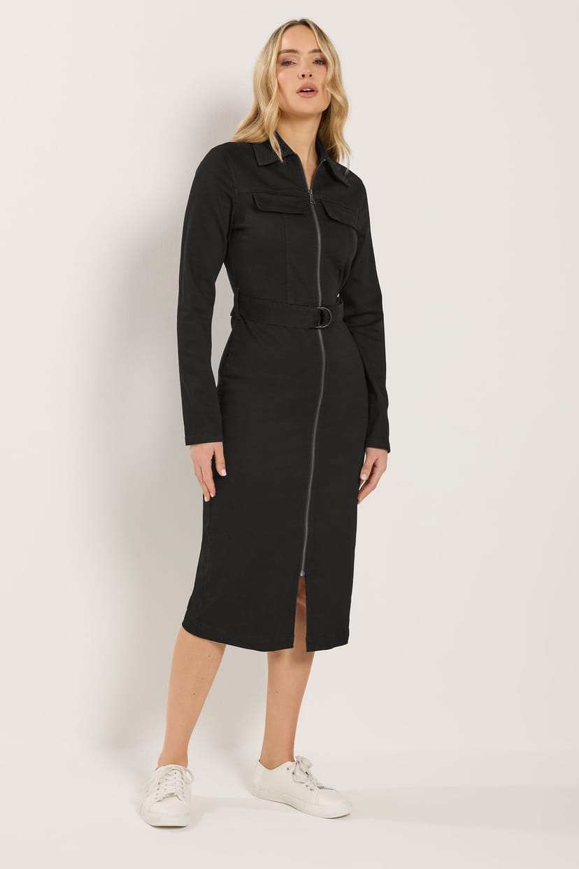 Stylish black denim midi dress from Long Tall Sally. Crafted from durable denim, it features long sleeves, a zip-through fastening, and a midi length for all-day comfort. Ideal for casual and work settings.
