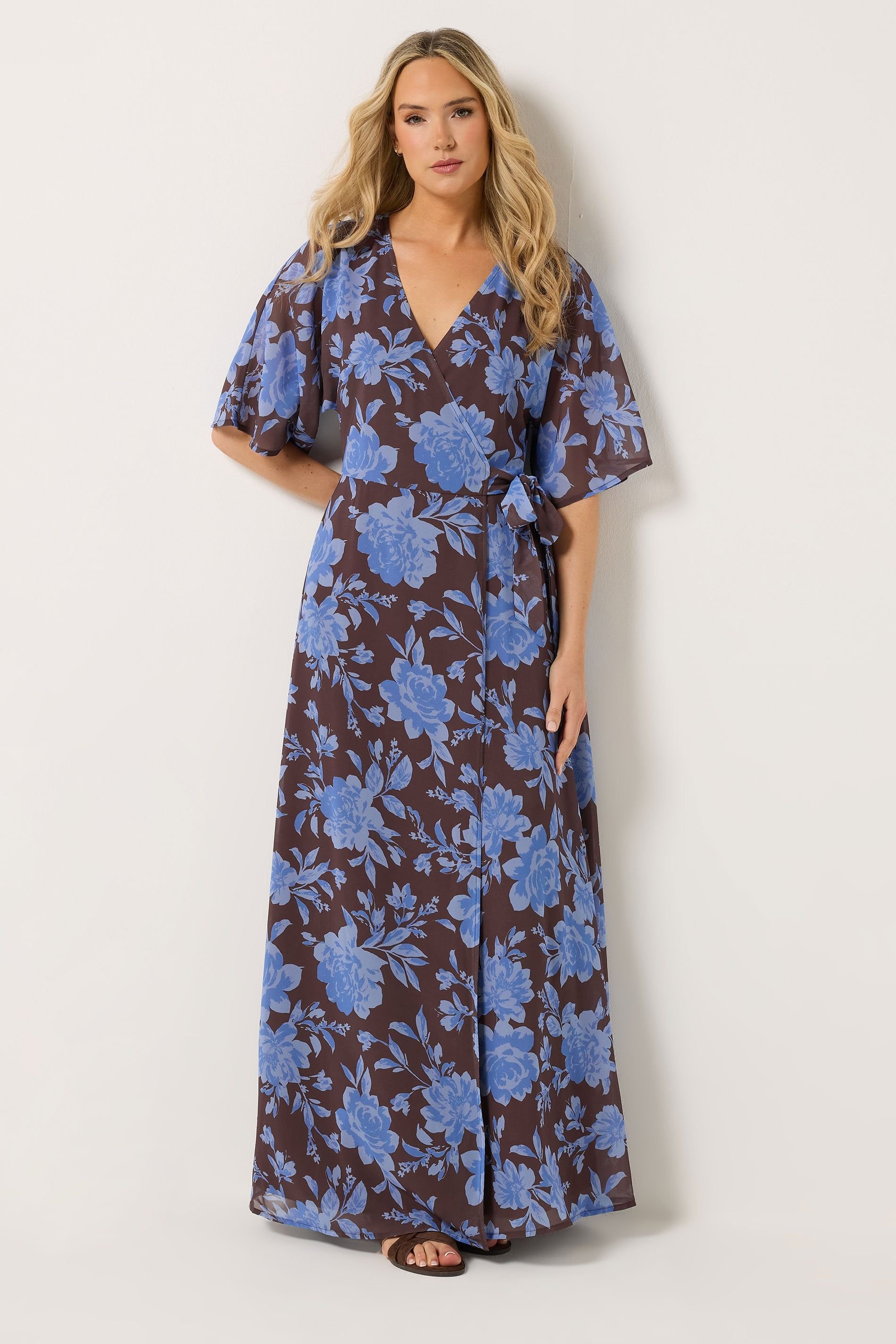 The Long Tall Sally Chocolate Floral Wrap Maxi Dress is available in sizes 12, 14, 16, 18, 20.