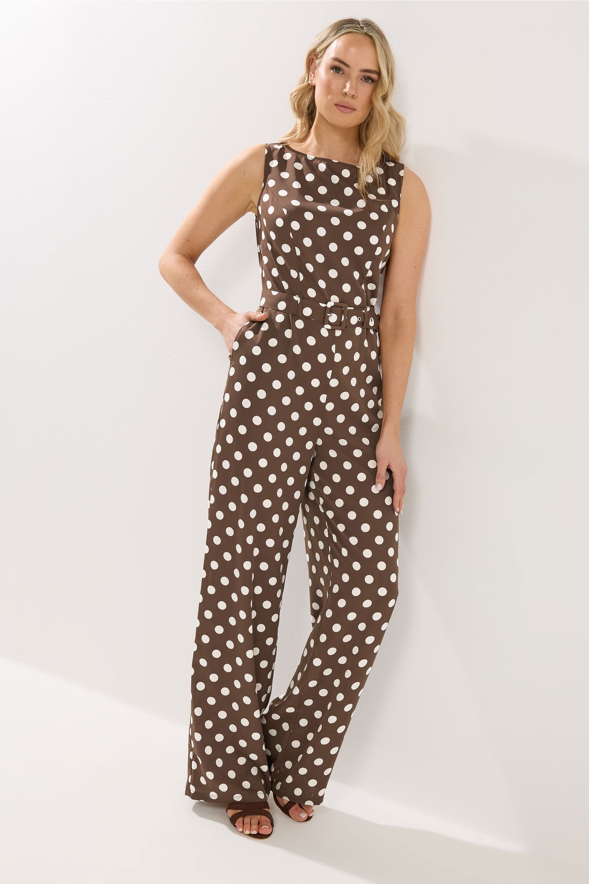 Elegant polka dot jumpsuit in chocolate hue. Crafted from soft jersey fabric, it features a sleeveless design and wide leg style. Ideal for effortless off-duty style.