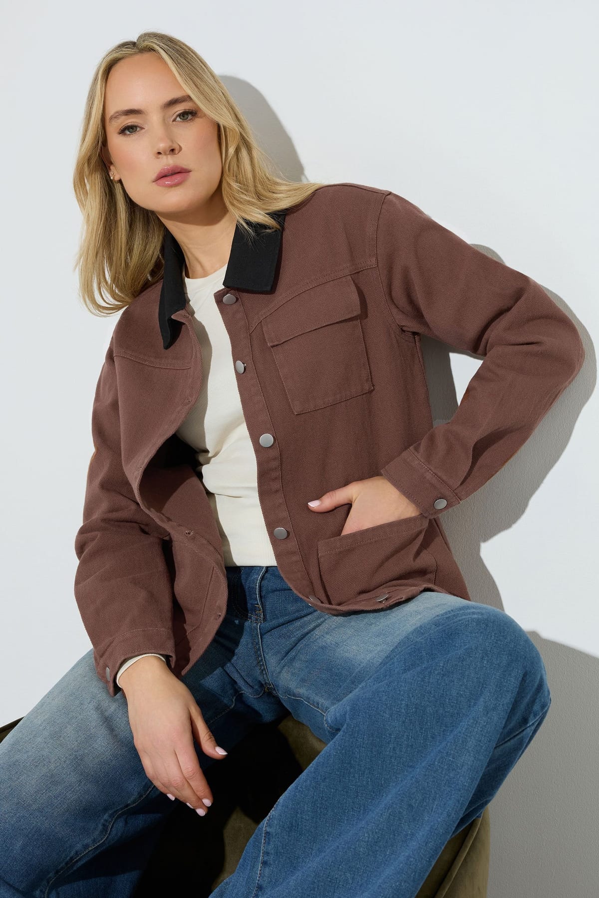 Versatile chocolate twill barn jacket from Long Tall Sally. Features multiple pockets and button fastenings. Layer over a fine knit and jeans for an elevated everyday look.