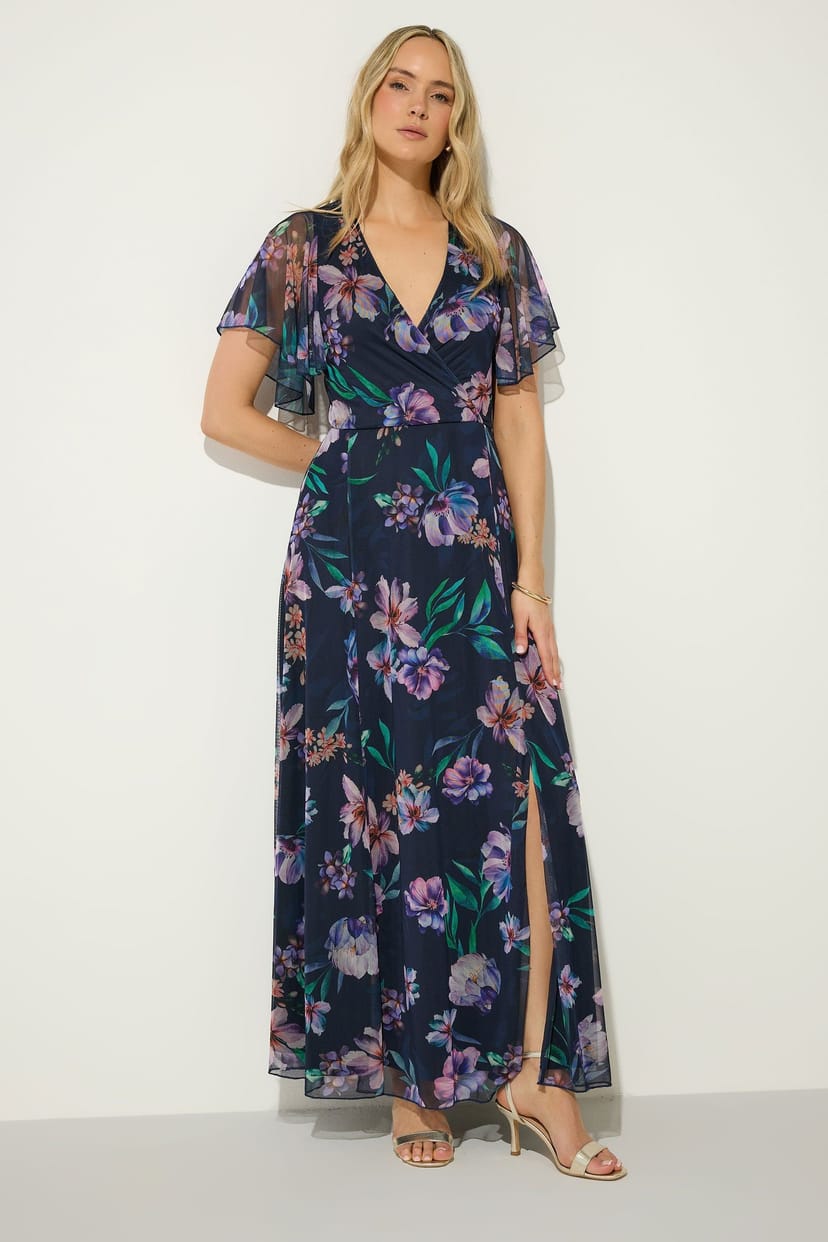 The Long Tall Sally Dark Navy Floral Mesh Wrap Maxi Dress is ideal for evening, party, date-night.