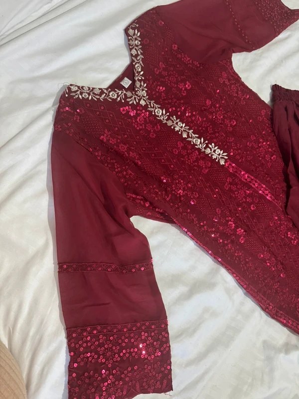 This stunning 3-piece suit comes in a rich deep maroon shade, perfect for festive occasions and formal gatherings. The outfit features a beautifully embellished long kameez adorned with intricate sequin work throughout and delicate gold embroidery along the neckline, adding a refined and luxurious touch. Paired with matching straight-cut trousers in a smooth, flowy fabric for comfort and elegance.