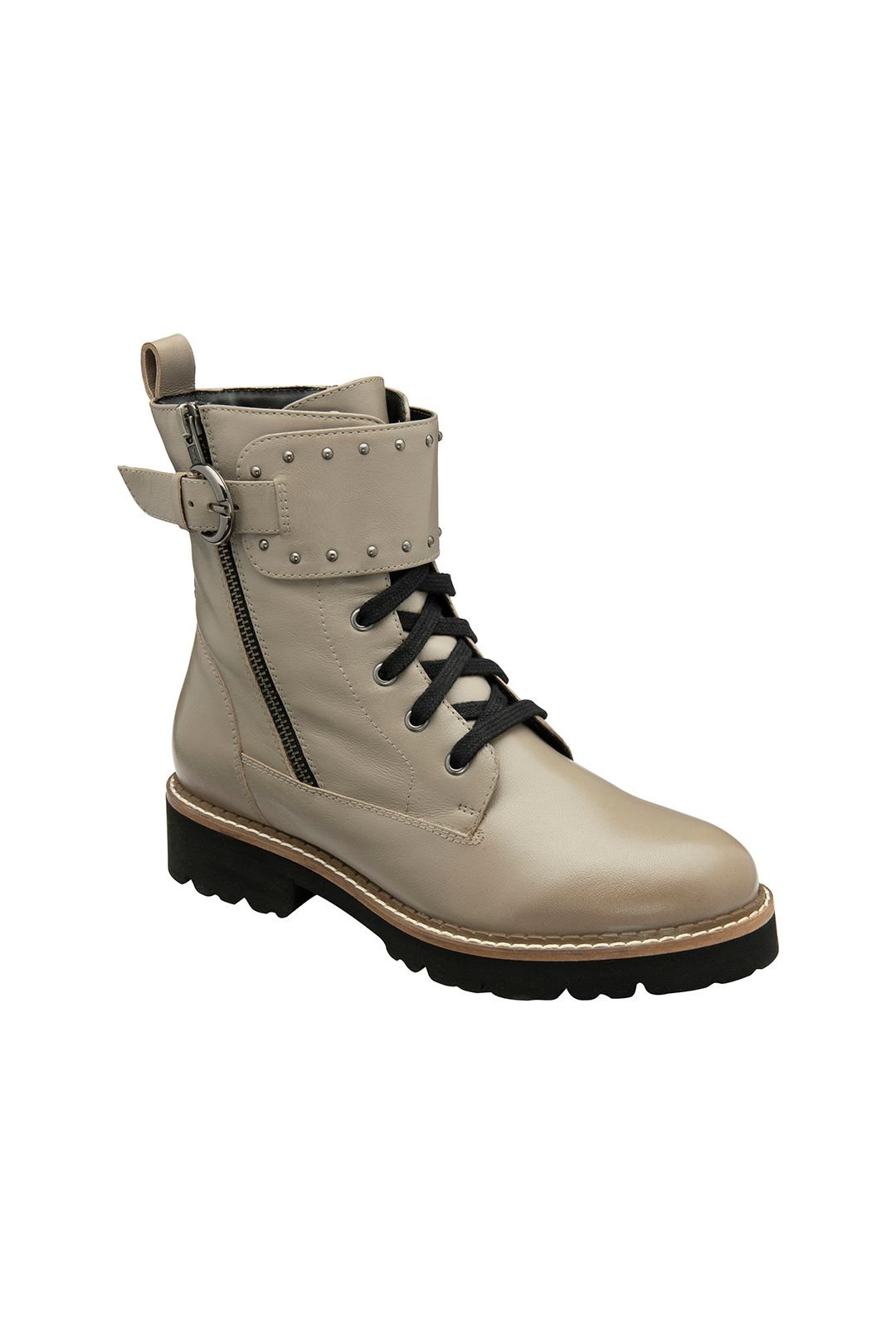 Stylish ankle boots in beige leather with a cleated sole and lace-up fastening. Features an inside zip for easy wear, perfect for casual outings.