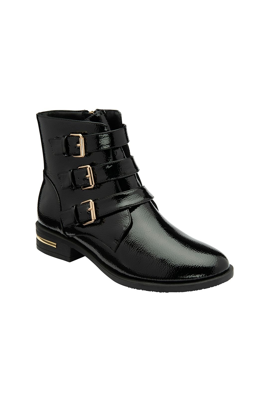 Modern black patent leather ankle boots with a striking design. Featuring a trio of gold buckles and a metal trim insert in the 3cm heel, these boots add a stylish touch to any outfit.