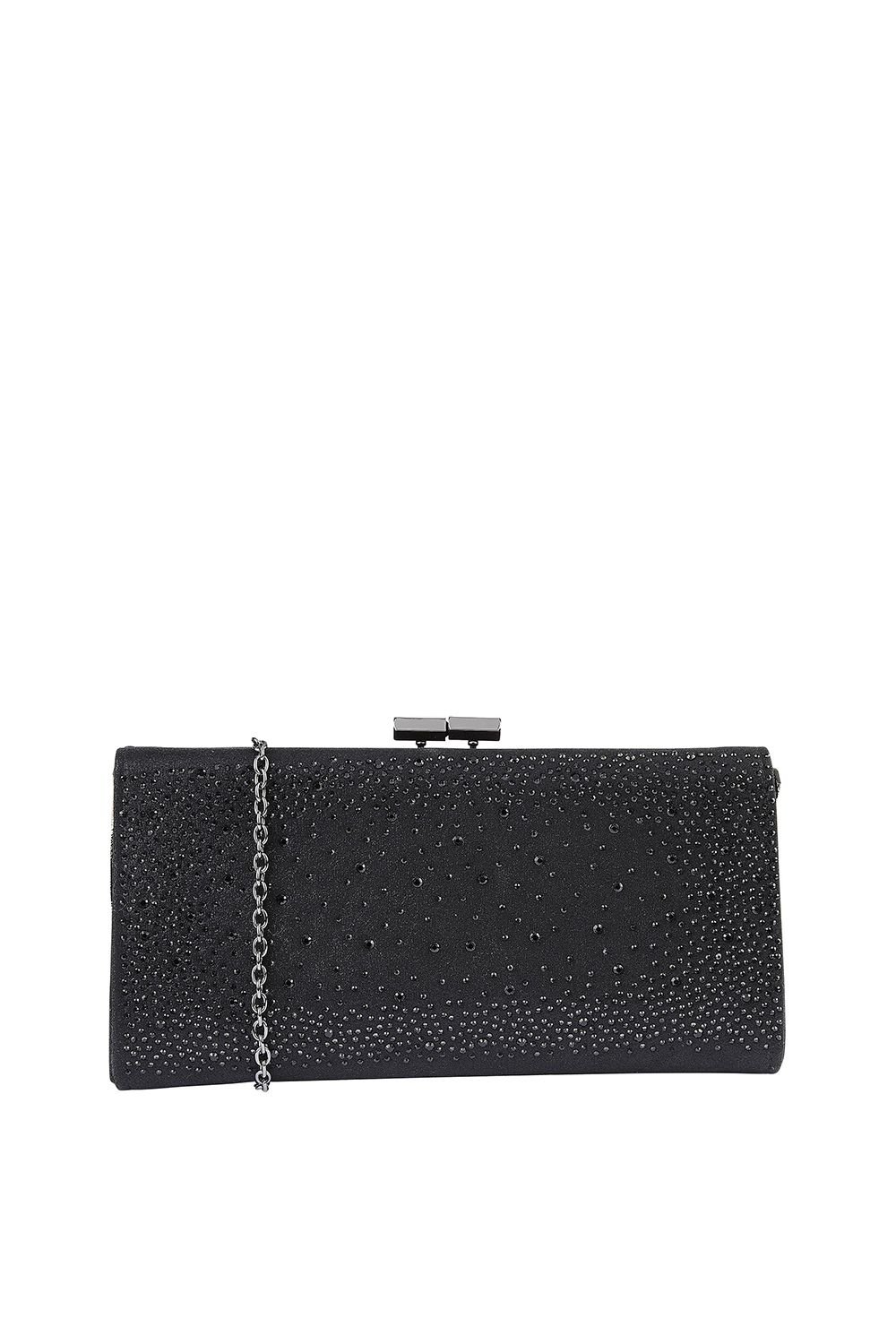 Elegant black clutch bag adorned with sparkling diamantes, perfect for a glamorous look. Features a detachable chain shoulder strap and a clasp fastening. Ideal for enhancing red carpet appearances.