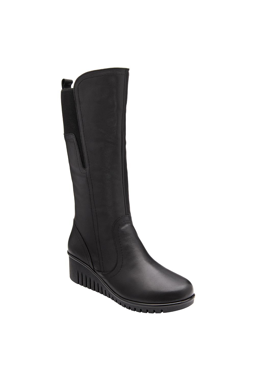 Stylish black leather wedge mid-calf boots by Lotus. Designed for versatility with an elasticated inset panel for a snug fit and a 4.5cm wedge heel for added height. Perfect for casual outfits.