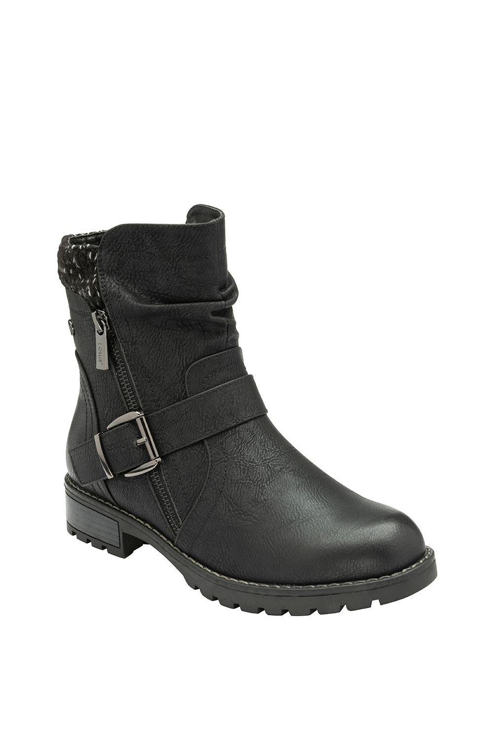 Stylish black faux leather ankle boots with a biker-inspired design. Features include a decorative buckle strap, exposed zip, cleated sole, and a knitted textile insert at the collar. Perfect for casual wear.