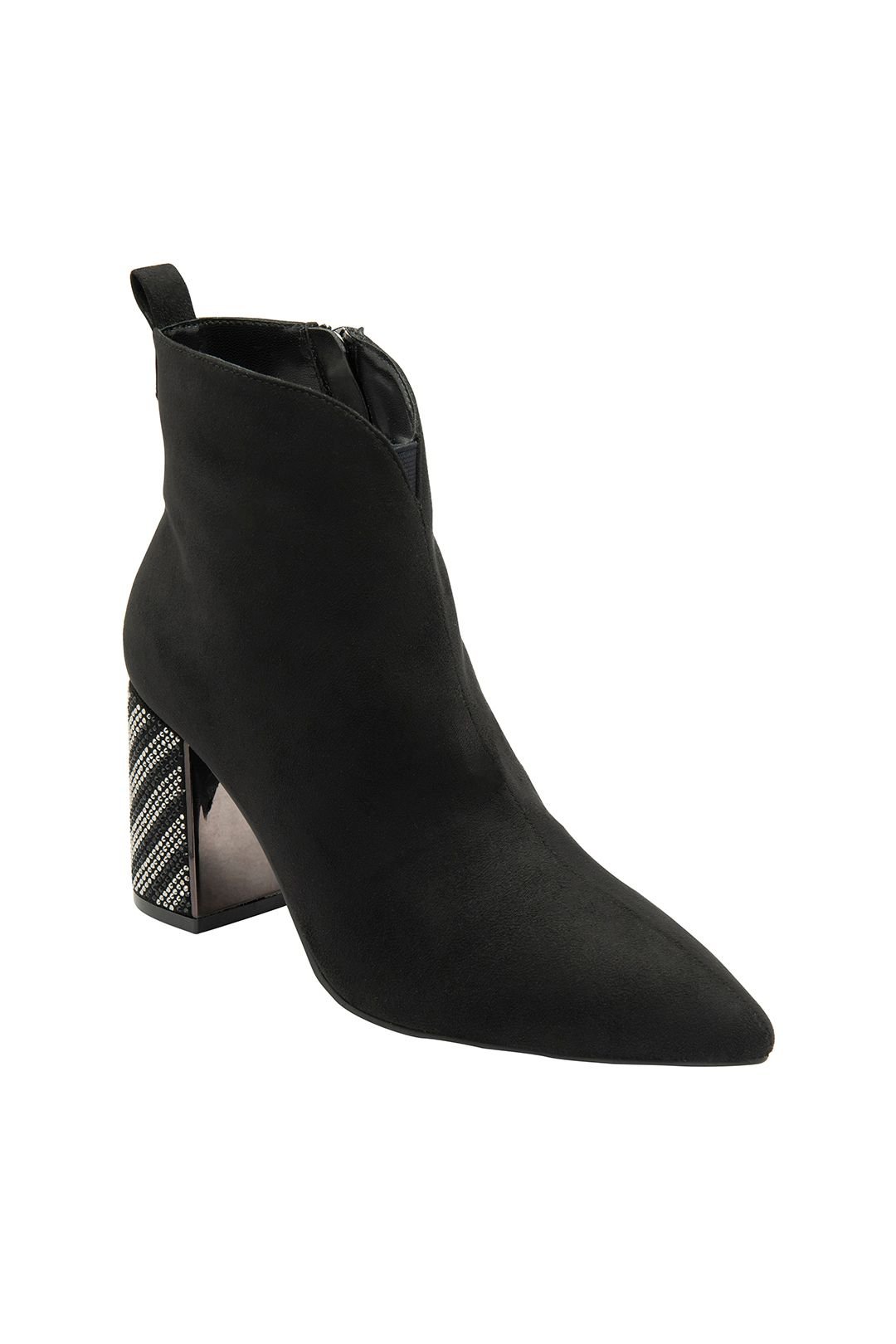 Stylish black faux suede ankle boots with an 8cm block heel. The pointed toe design is complemented by diagonal diamante stripes on the heel for a glamorous touch. Perfect for evening wear or special occasions.