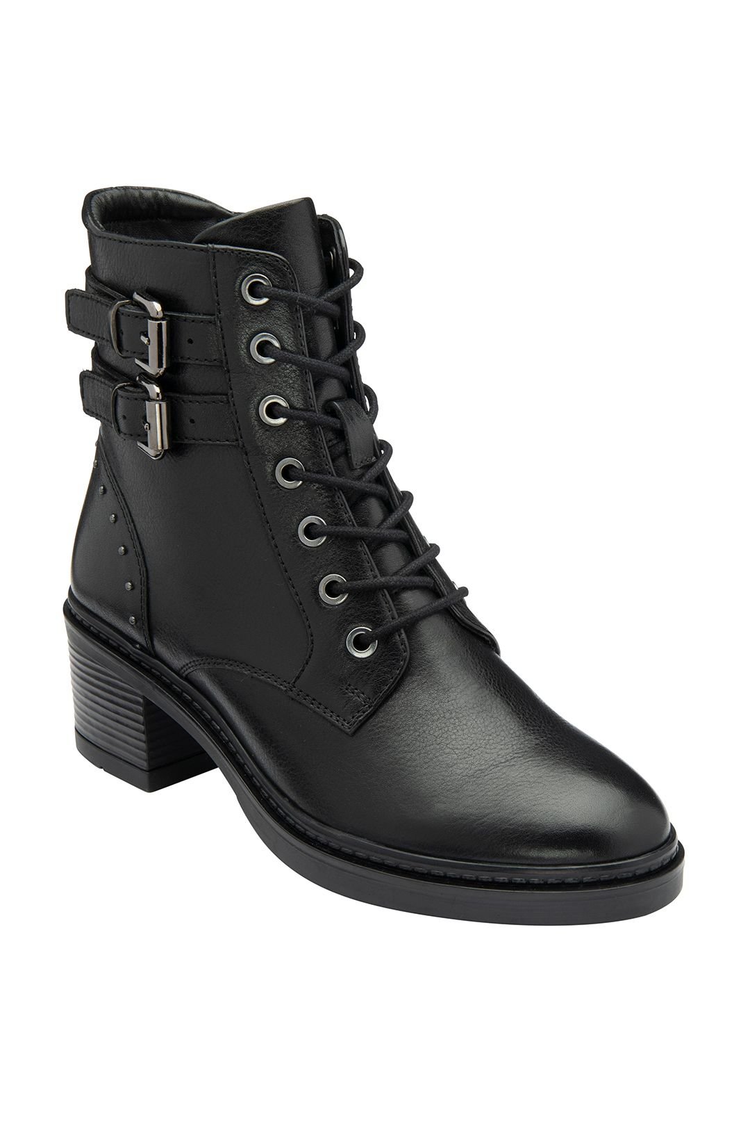 Elegant black leather ankle boots with a decorative buckle and studs. Perfect for adding a bold touch to any outfit.