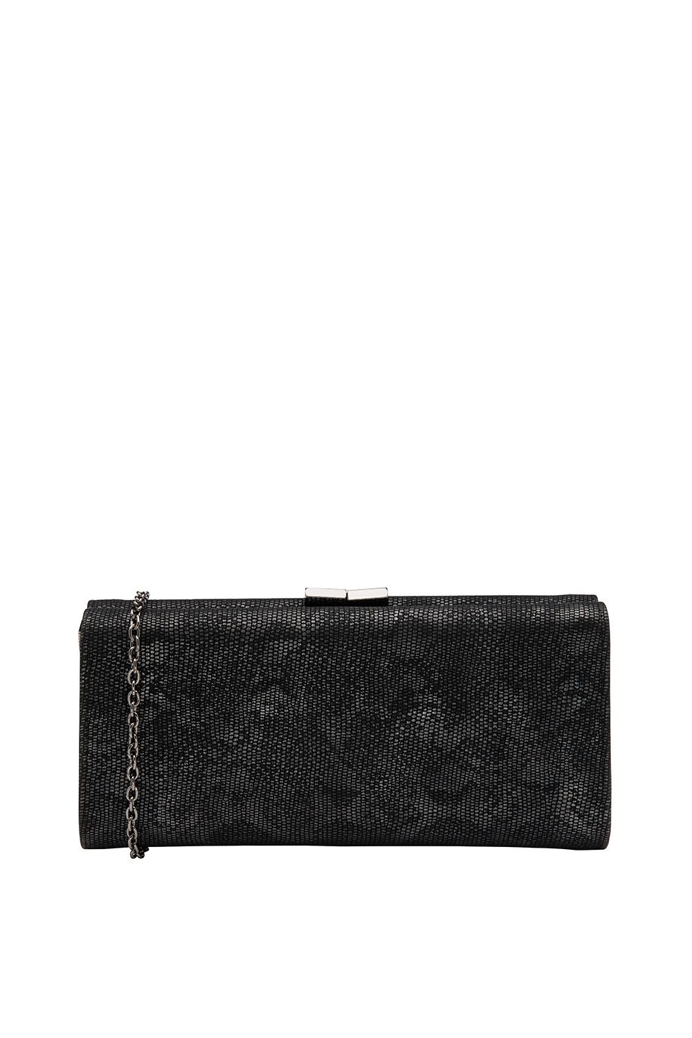 Stylish black reptile print clutch bag by Lotus. Features a clasp fastening, a detachable chain shoulder strap, and an internal slip pocket. Perfect for adding a touch of elegance to any outfit.