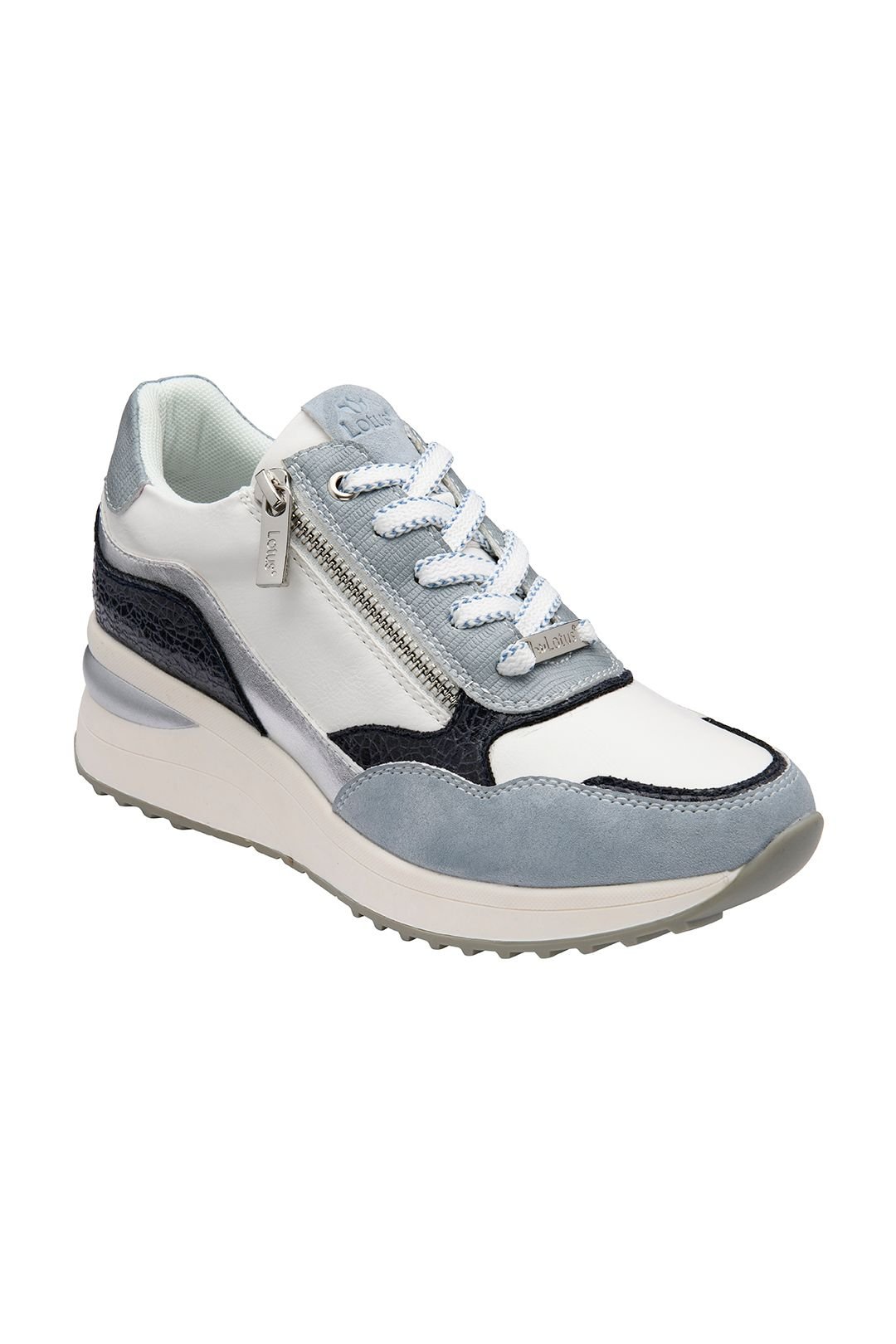 Modern blue trainers from Lotus featuring a concealed 5cm wedge heel, colour blocking, and metallic details. The side zip offers easy wear, perfect for a stylish yet comfortable look.