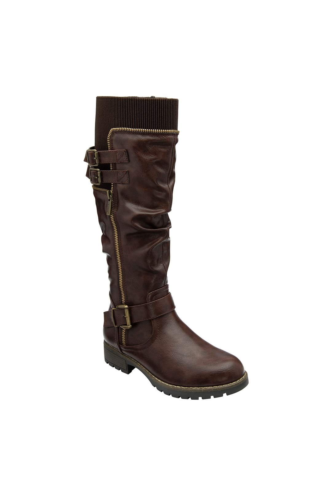 Elegant brown faux leather knee-high boots with a slouchy leg design. Featuring buckle detailing, an exposed zip, and a knitted fabric top collar. The boots have a 3.5cm heel and a functional inside zip for easy wear.