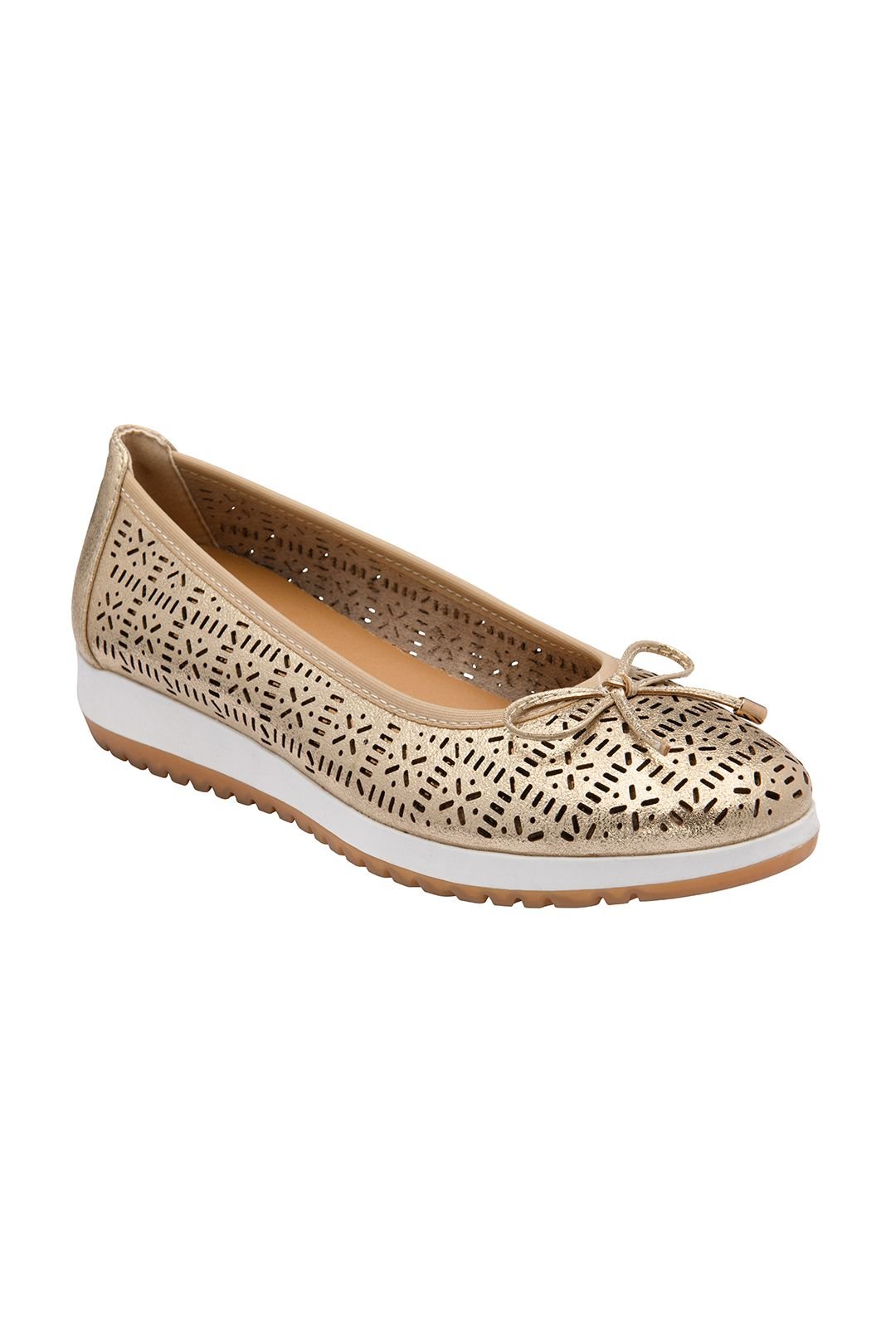 Stylish gold ballerina shoes with unique cut-out detailing for breathability. Features a bow detail and a comfortable 2.5cm sole. Perfect for pairing with trousers or dresses.
