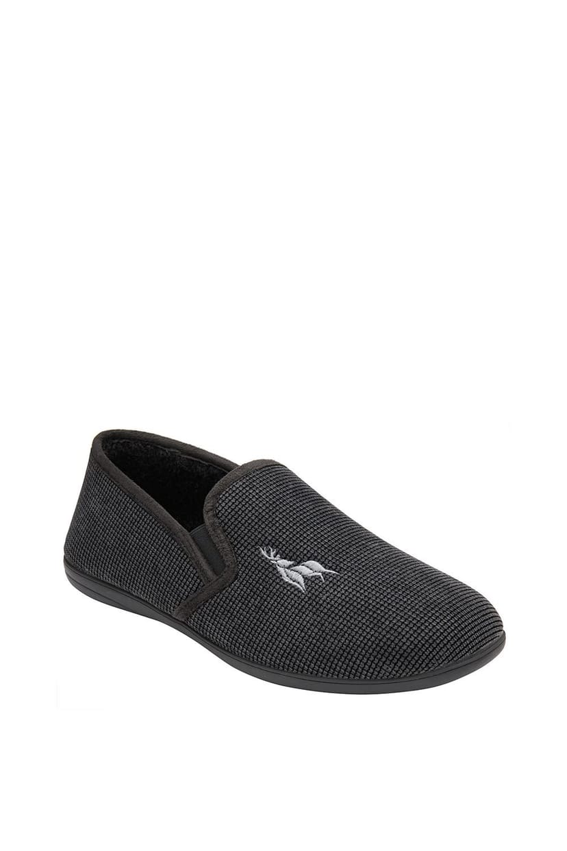 Experience ultimate comfort with the Lotus 'Davida' full shoe slipper. Crafted from patterned corduroy, these slippers feature a decorative embroidered stag for a touch of style. The twin elasticated panels make them easy to slip on and off.