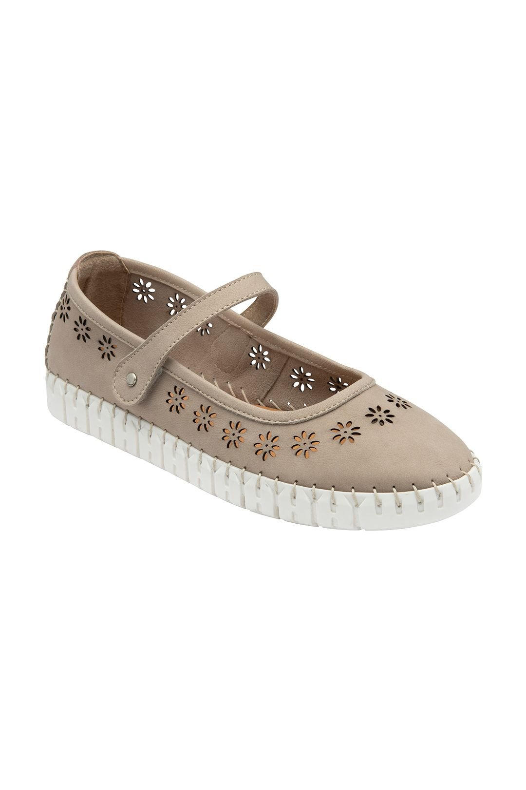 Stylish flat shoes from Lotus featuring a natural nubuck finish with floral cutout detailing. The ballerina-style design is perfect for casual wear.