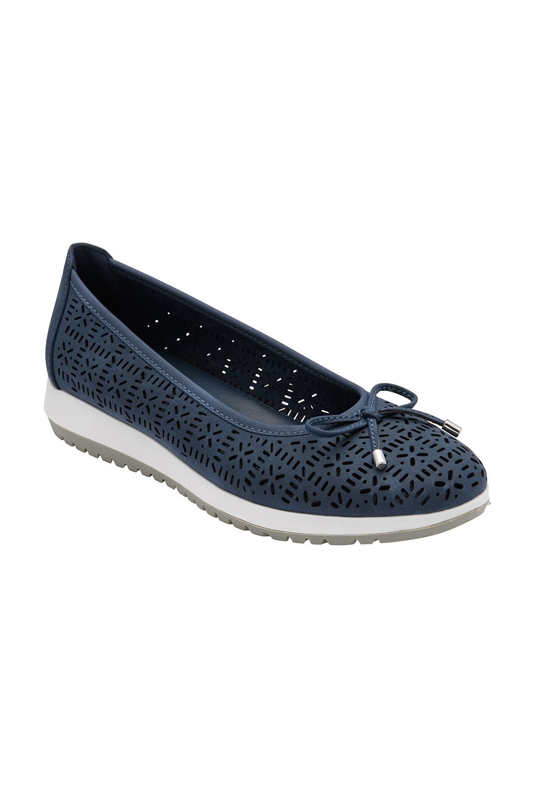 Stylish navy ballerina shoes by Lotus featuring a unique upper with cut-out detailing for breathability. The slip-on design is finished with bow detailing and a comfortable 2.5cm sole for added lift.