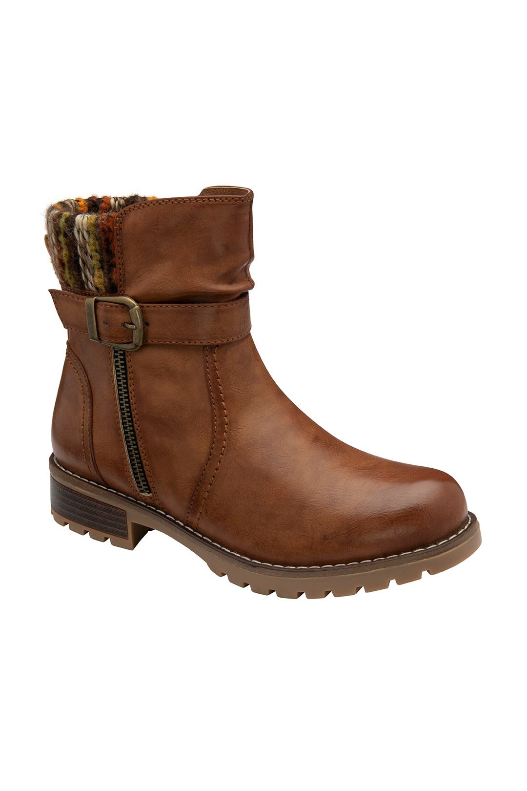 Chic and versatile Lotus 'Triana' ankle boots in tan. Featuring a distinctive wrap-around buckle detail and a knitted top collar for a fashionable look. The functional zip detailing enhances their practicality.