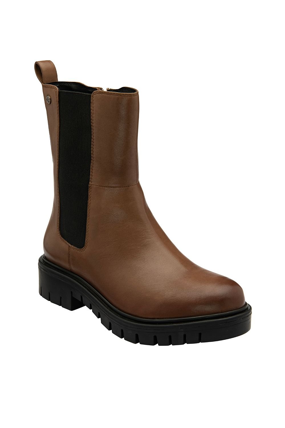 Classic Chelsea-style mid-calf boot in taupe leather. Features elasticated side panels and a pull tab for easy wear. The heavy cleated sole adds a contemporary twist to this timeless design.