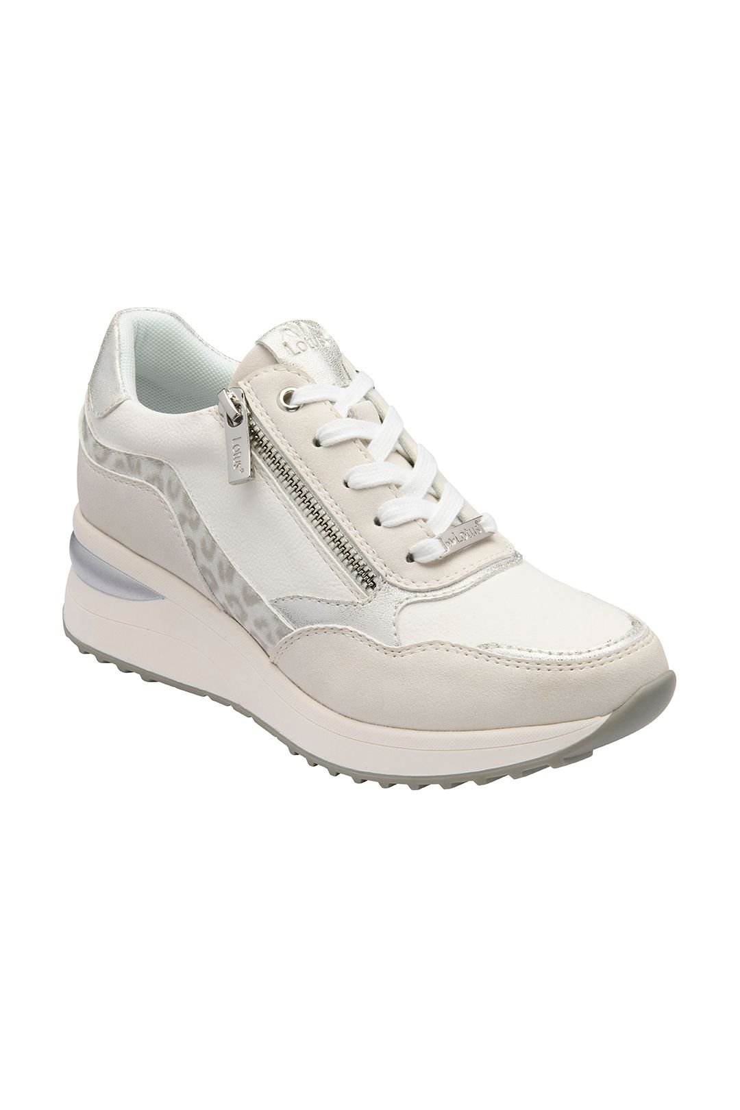 Modern white trainers from Lotus featuring a concealed 5cm wedge heel, colour blocking, and metallic details. The side zip ensures easy wear. Perfect for everyday comfort and style.