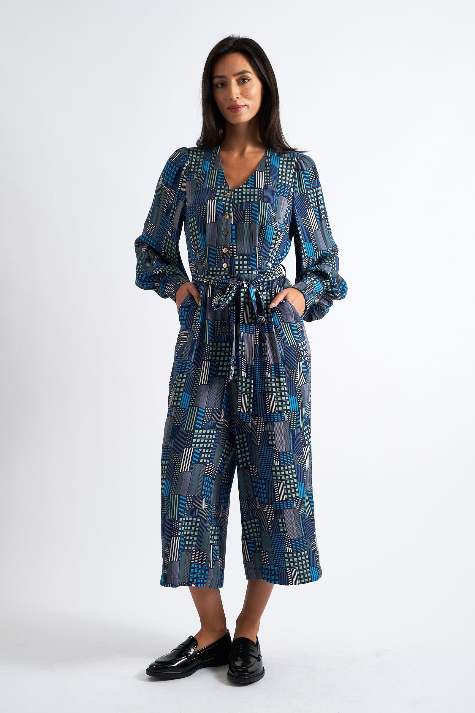Stylish blue geo city print jumpsuit with a flattering V neckline and elasticated waist featuring a self-tie belt. Crafted in a navy-based architectural style, this jumpsuit offers a cropped leg silhouette and essential pockets for convenience.