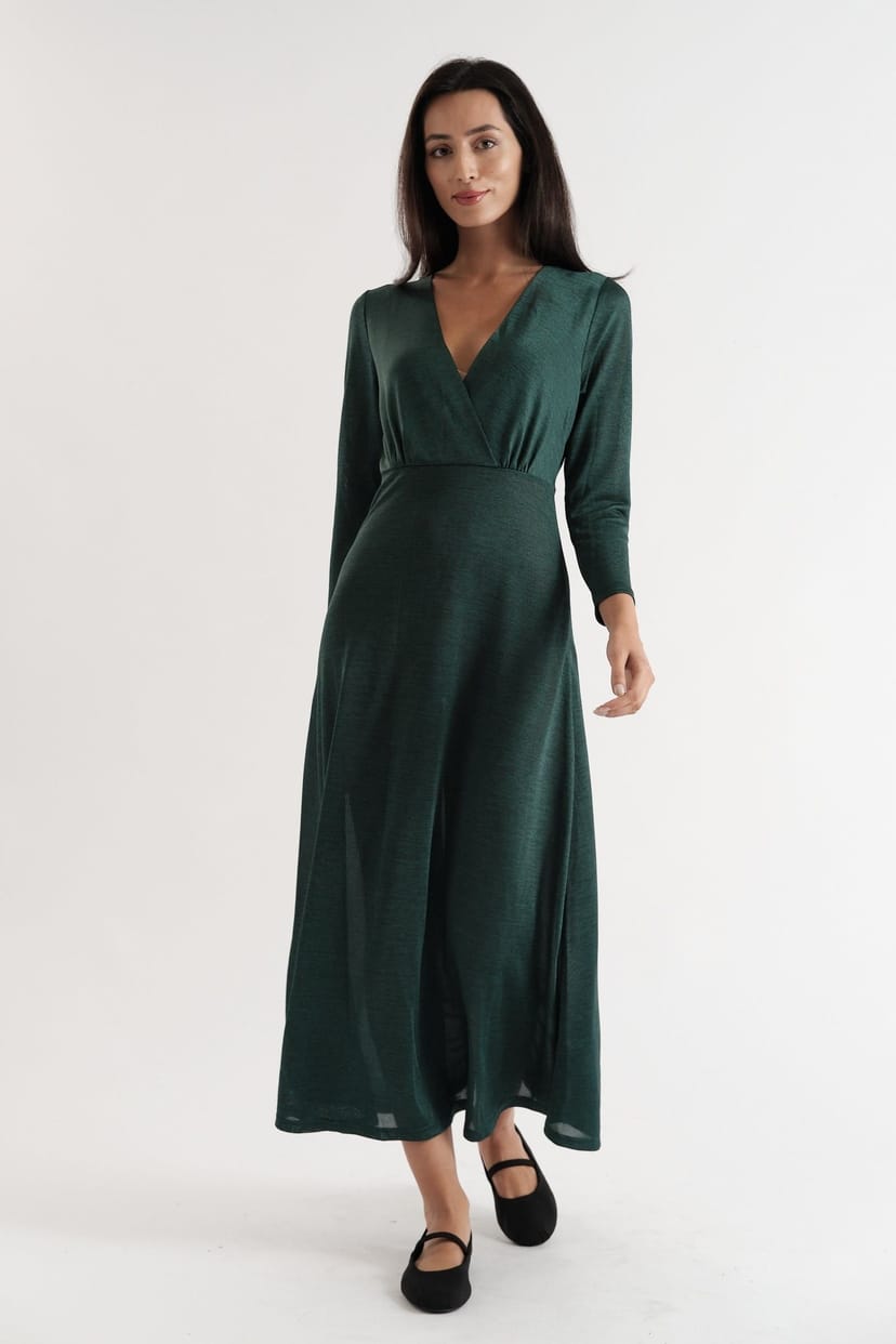 Elegant green jersey wrap midi dress with a flattering wrap bodice and long sleeves. Perfect for any occasion.