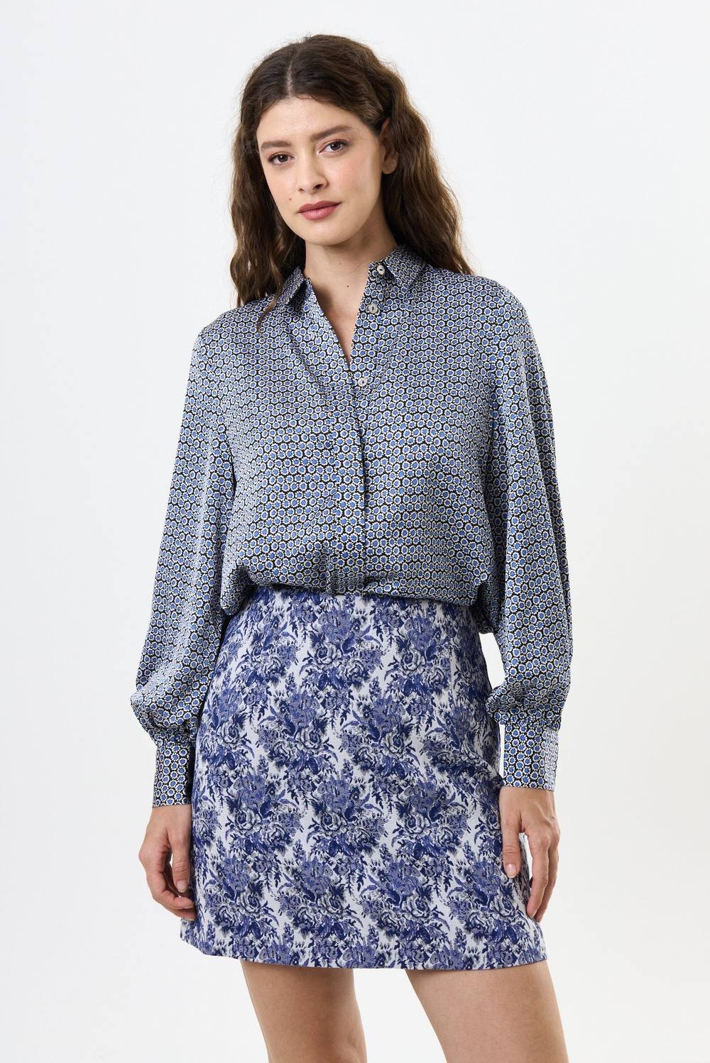 Vintage-inspired A-line mini skirt in blue floral jacquard. Woven using traditional techniques, this skirt adds a touch of history and elegance to your wardrobe. Perfect for casual outings or smart-casual events.