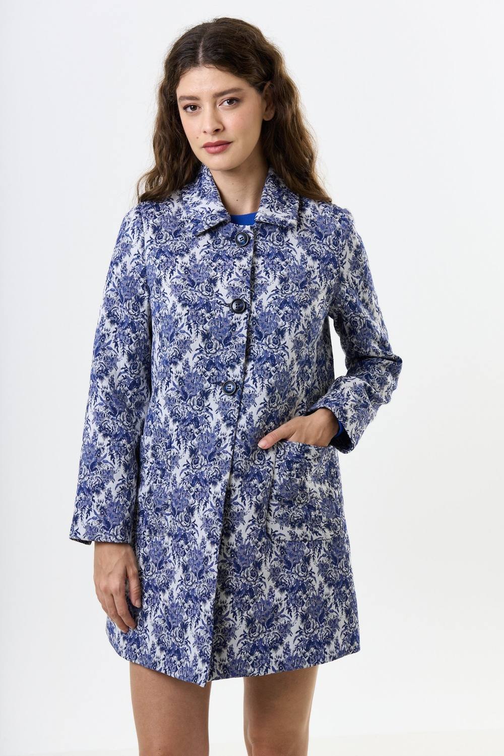 Stylish short coat in navy and white floral jacquard with a Wedgwood-inspired design. Features a premium acetate shot lining and two patch pockets for a touch of functionality. Ideal for casual wear.