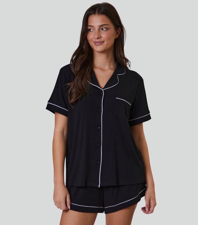 Experience ultimate comfort with Loungeable's black ribbed pyjama set. Featuring a relaxed fit and contrast piping, this set is perfect for a relaxed evening at home.