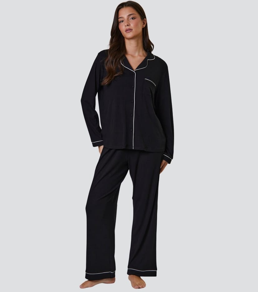 Loungeable's black ribbed pyjama set offers effortless comfort with its relaxed fit and soft ribbed construction. Finished with contrast piping, it's perfect for unwinding at home and enjoying a cosy night in.