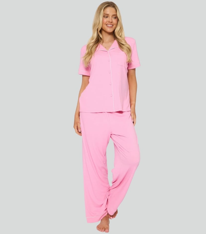 Loungeable's bright pink ribbed pyjama set offers ultimate comfort with its soft, ribbed jersey fabric and relaxed fit. Featuring contrasting piping, this set includes a short-sleeve shirt and wide-leg trousers. Ideal for lounging at home.