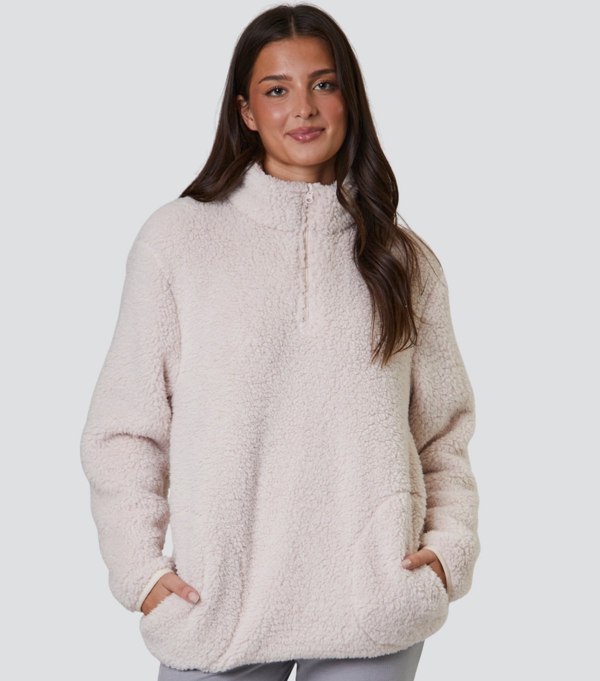 Cozy cream borg jumper with a quarter zip front. Perfect for loungewear, featuring a relaxed fit and long sleeves. Ideal for casual days at home.
