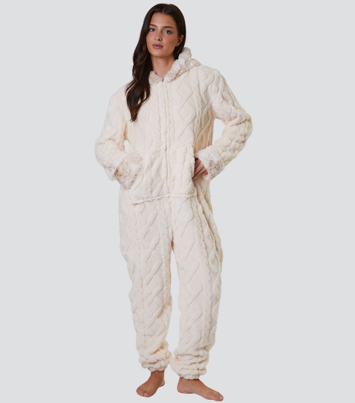 Cozy cream cable fleece onesie with a hooded neckline and long sleeves. Features a full-length design with tapered cuffs and a front zip fastening. Perfect for lounging at home.