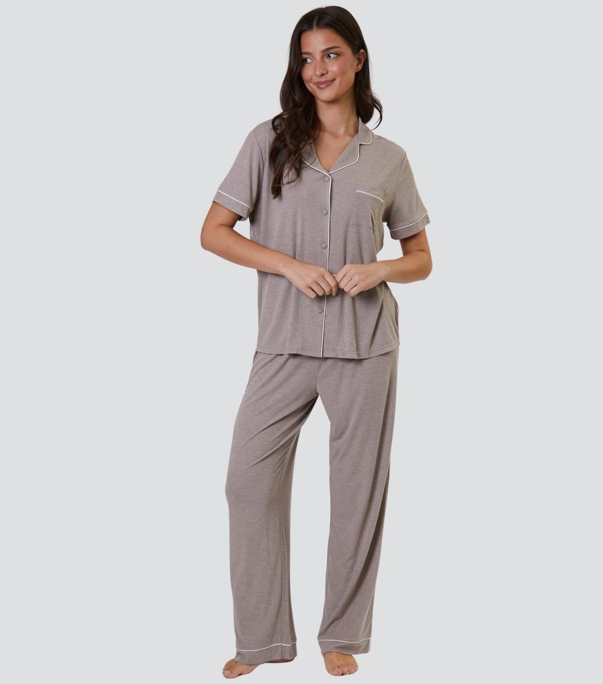 The Loungeable Oatmeal Ribbed Pyjama Set is made from cotton, elastane.