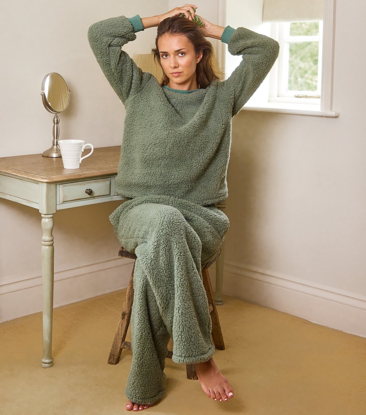 Cozy green borg lounge set perfect for relaxing at home. Featuring a crew neck and long sleeves, this set is designed for ultimate comfort.