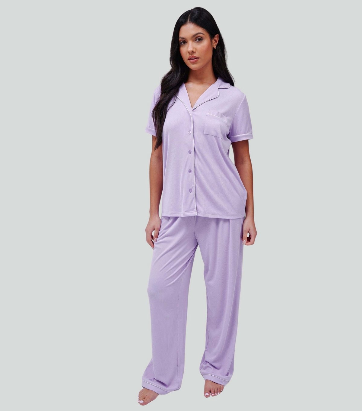 Lounge in style with this lilac jersey pyjama set from Loungeable. The classic button-up shirt and relaxed trousers are perfect for unwinding at home. Ideal for weeknights and lazy weekends.