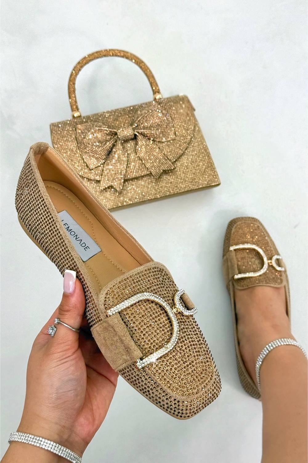 Chic Light Brown suede loafers adorned with sparkling crystals and sequins. Perfect for adding a touch of glamour to any outfit.