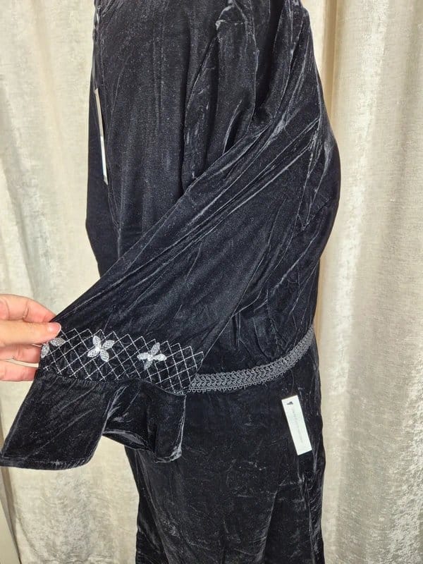 Elegant black velvet mini dress from Love & Roses, adorned with silver embellishments. Features a sheer mesh panel with floral embroidery and a satin ribbon belt. Perfect for evening events or special occasions.