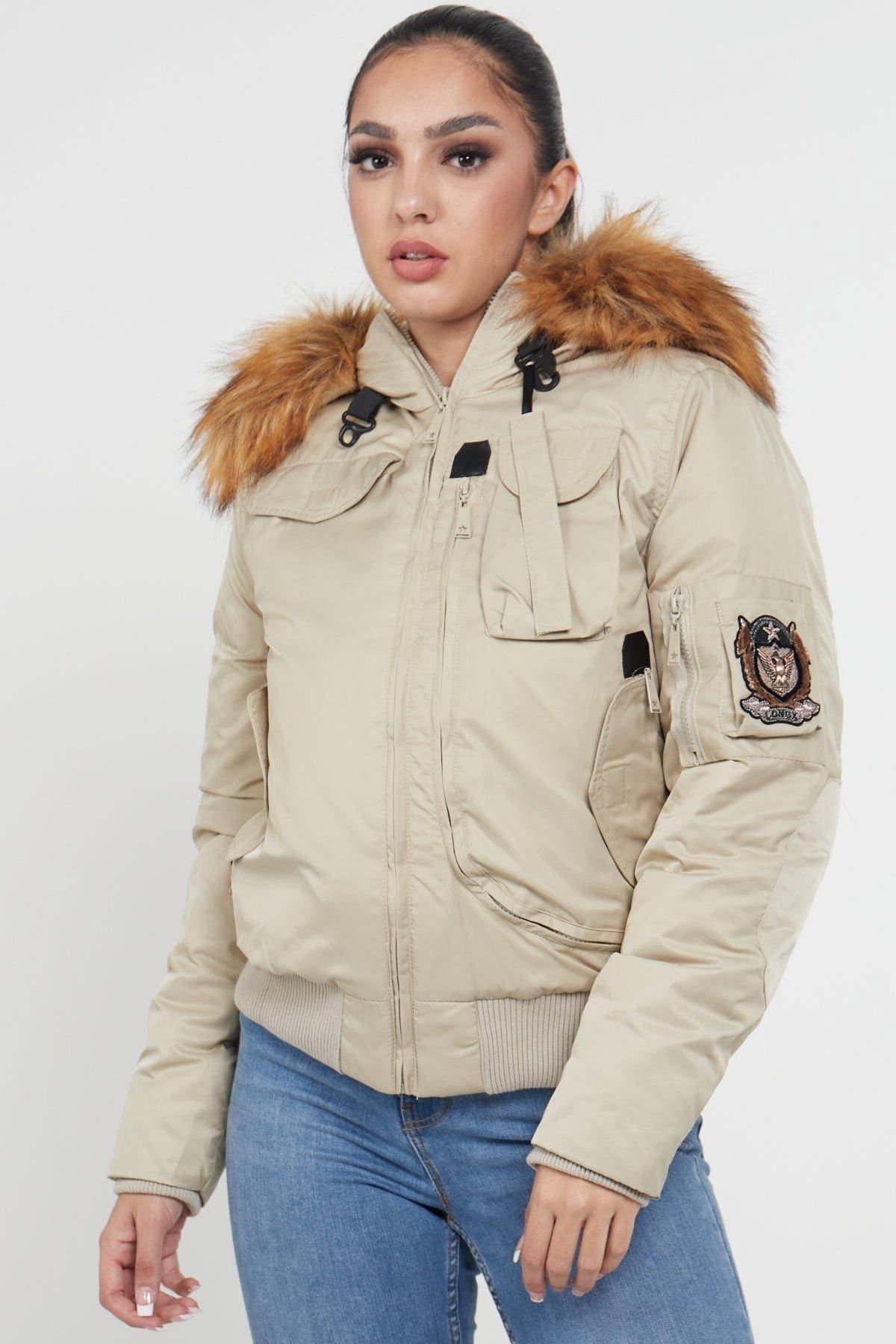 Stylish bomber jacket in beige featuring a detachable faux fur hood, multiple pockets, and zip details. Perfect for adding an edgy touch to your winter wardrobe.