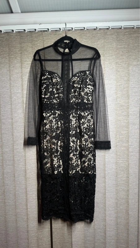 Beautiful black floral lace overlay with a nude lining giving it an elegant contrast. The high neckline with sheer mesh detail and long sheer sleeves make it perfect for evenings, events, parties, or special occasions.
