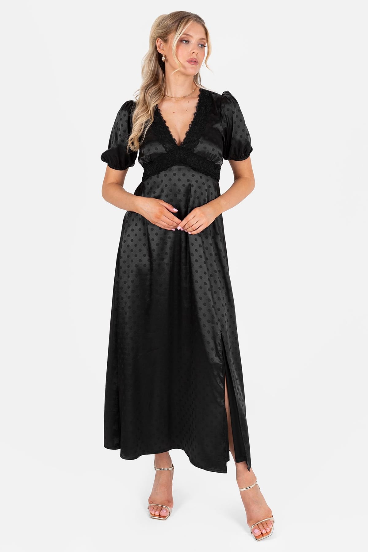 This black satin midi dress is perfect for evening events. With a spotty jacquard finish, V neckline, lace-trimmed empire waist, and shirred back, it's both flattering and comfortable. Style with black heels or go bold with red shoes and a chic bag.