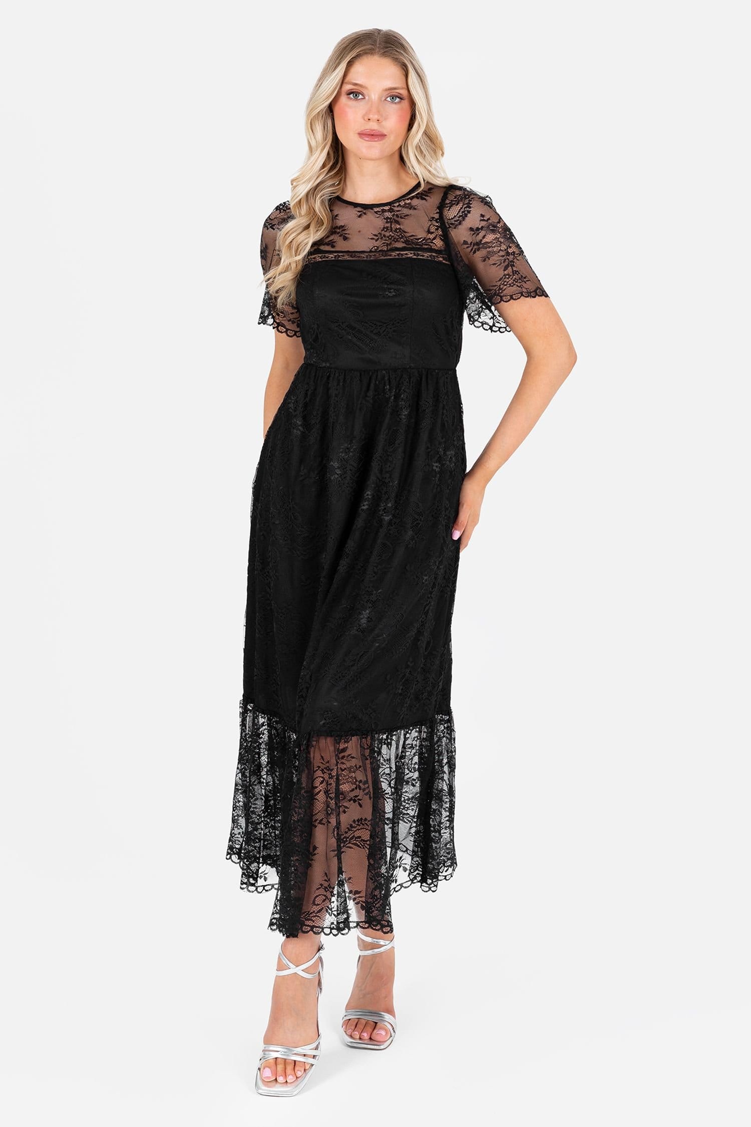 Lovedrobe Black Lace Midi Dress with Tiered Skirt