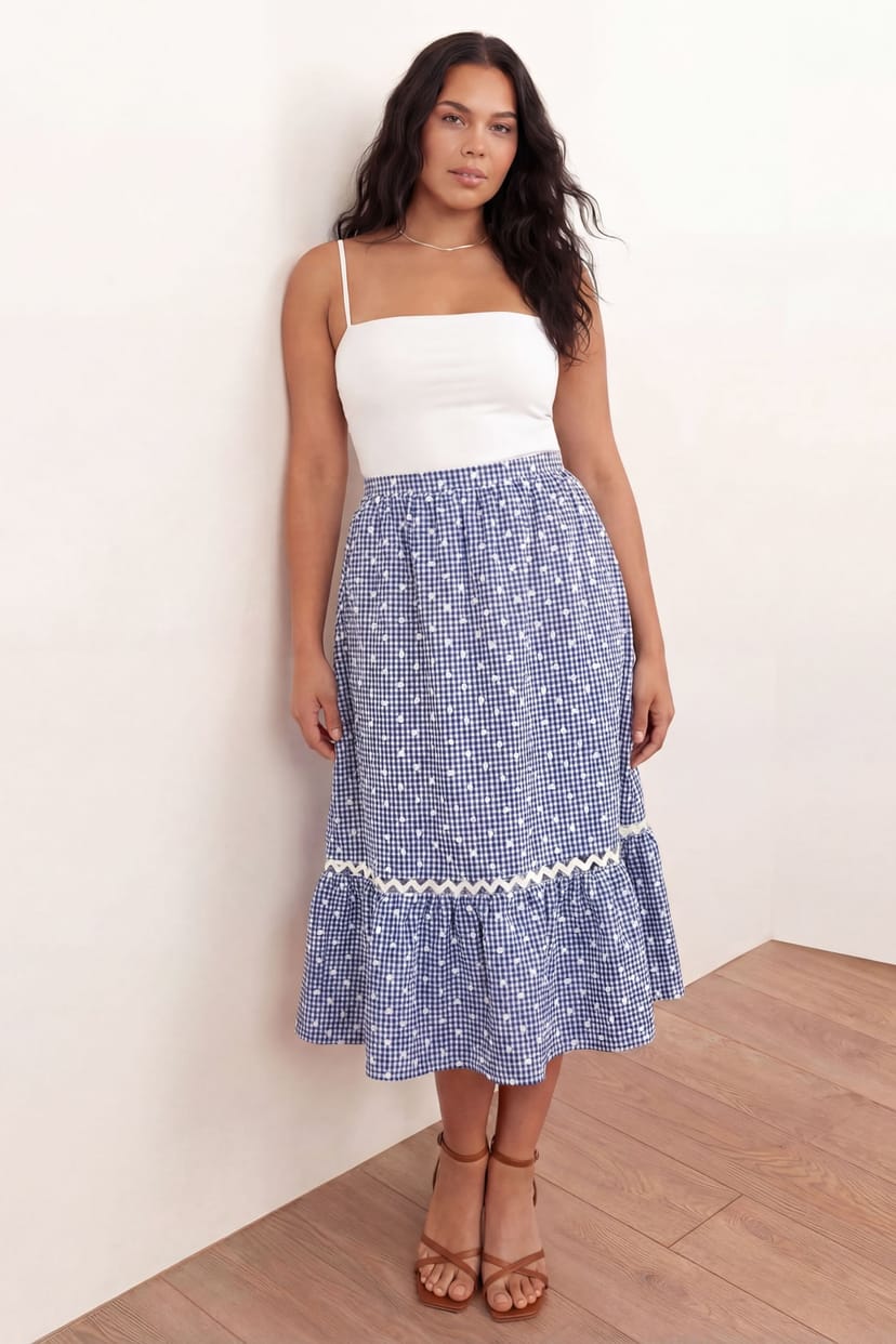 Playful midi skirt in blue gingham and white polka dots. Features an elasticated back for comfort, ric rac trim, and a flared hem for movement. Ideal for a daytime look.