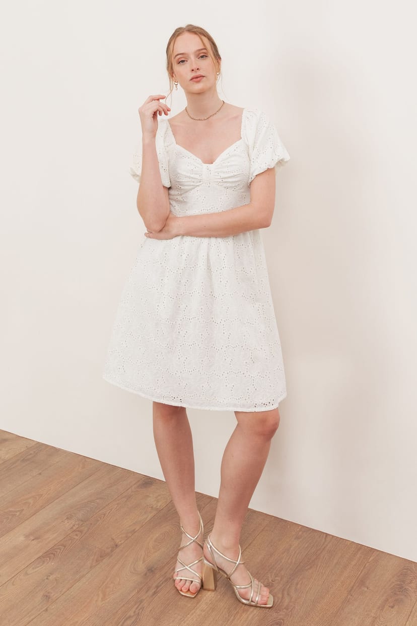 The Lovedrobe Cream Broderie Mini Dress with Bow Detail is available in sizes 10, 12, 14, 16, 18, 20, 22, 24, 8.