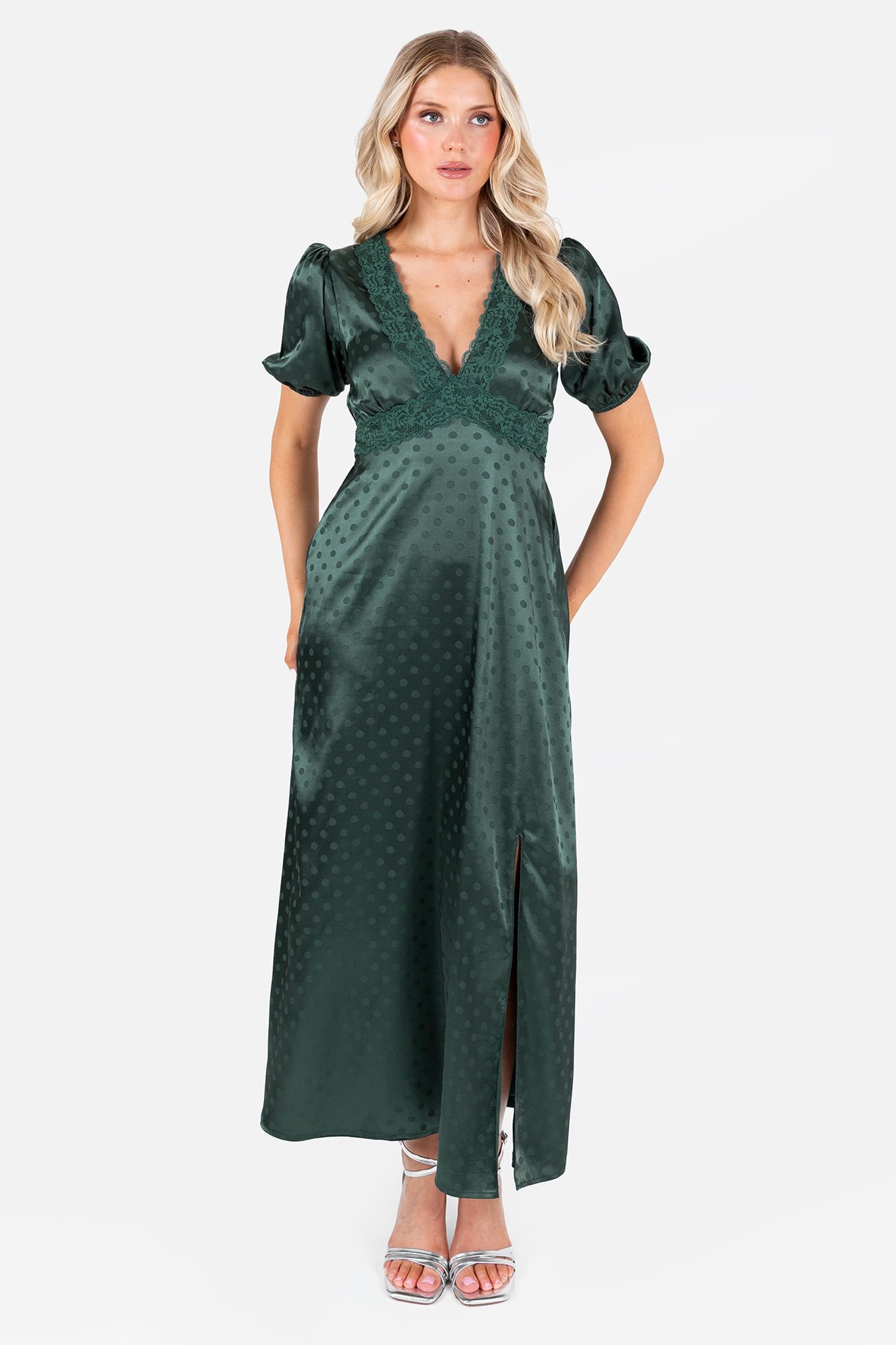 This emerald green polka dot midi dress features a V neckline and lace-trimmed empire waist. The shirred back ensures a comfortable fit, making it both wearable and refined.