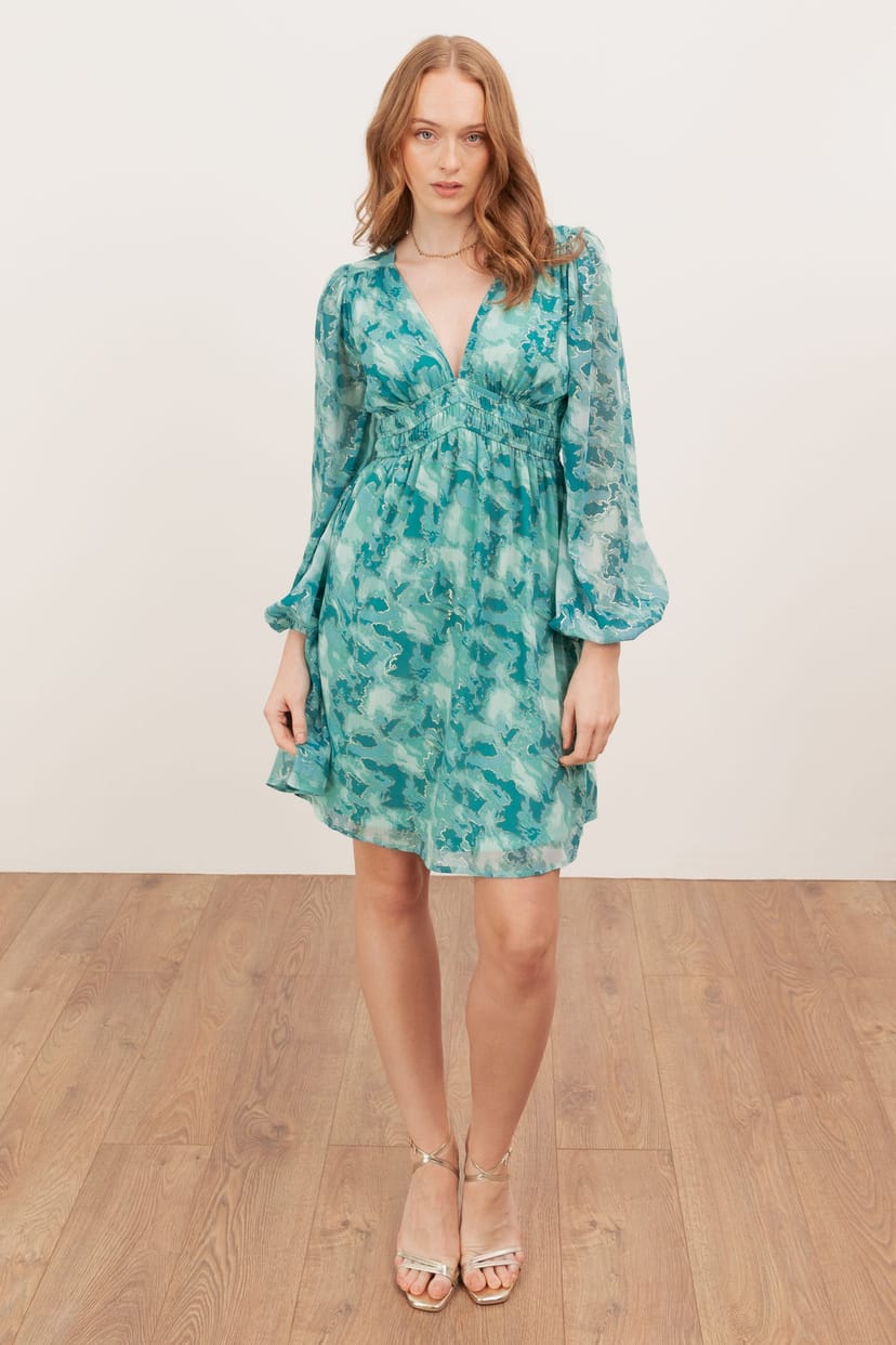 This teal chiffon mini dress with foil shimmer features a flattering V-neckline, floaty long sleeves, and an elasticated empire waist. The lightly gathered mini skirt adds a flirty touch. Perfect for evening events or casual outings.